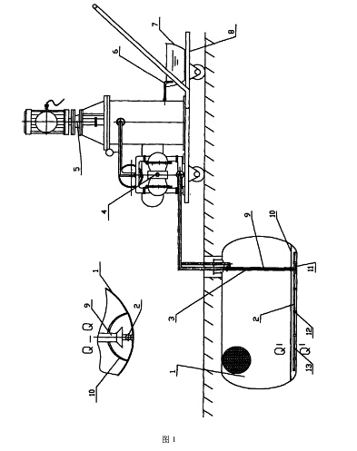 所述的噴油橫管2每間隔300-500毫米的位置設置有一噴油口13(本附圖給出每380毫米設置一噴油口或一對噴油口)。第一位置的噴油口13設置在噴油橫管2的底部,相繼第二位置的噴油口13設置噴油橫管2的側壁上,為兩個對稱的噴油口13,如此交錯布置,噴油口直徑選為Φ20毫米。在噴射橫管2三個不同位置焊有卡箍12,卡箍12下支腳座落在防爆儲罐1的罐底上;交錯設計噴油口13的位置,其目的在于增強清污隧道10內清潔油攪動油泥的沖力并形成油、污混合流,同時又吸油管9受到氣動隔膜泵4的吸力,迫使清污隧道10內油、污混合流的流動。
