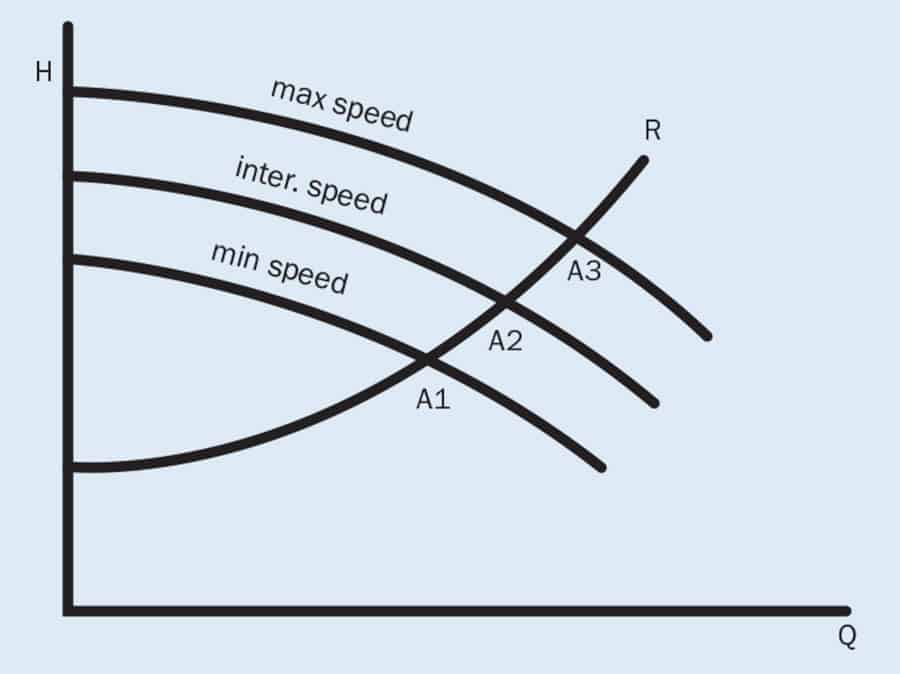 改變泵的速度會(huì)改變泵的性能曲線。這會(huì)改變與系統(tǒng)阻力曲線的交點(diǎn),從而導(dǎo)致流量發(fā)生變化。如下圖所示。