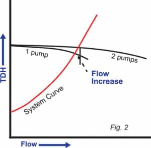 在圖 4 中,系統(tǒng)曲線和 TDH 曲線在大于關(guān)閉 TDH 值的 TDH 和低于曲線的最大 TDH 的 TDH 處相交。當(dāng)?shù)诙€(gè)泵啟動(dòng)時(shí),流量將僅增加到 TDH 與系統(tǒng)壓力匹配的第一個(gè)點(diǎn)。